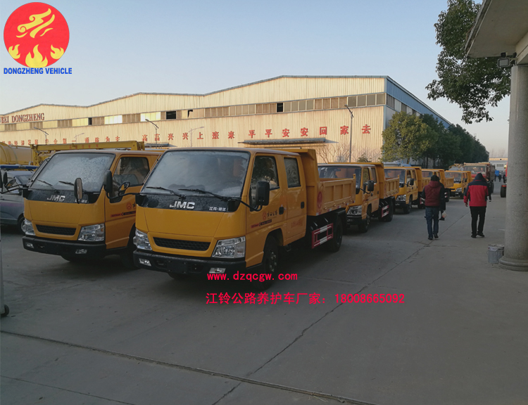 我公司生產(chǎn)的江鈴公路養(yǎng)護車是一款雙排座自卸車,該車實用性強,性價比高,是一款適用于公路養(yǎng)護作業(yè)的理想用車型。主要配置為江鈴雙排駕駛室,3360mm軸距,江鈴115馬力國五發(fā)動機,7.00R16LT鋼絲胎,油剎,5檔箱,排氣制動,原廠ABS。上裝部分主要由液壓系統(tǒng)、操作系統(tǒng)組成。舉升油缸為雙頂油缸,箱體標配邊3底4mm。