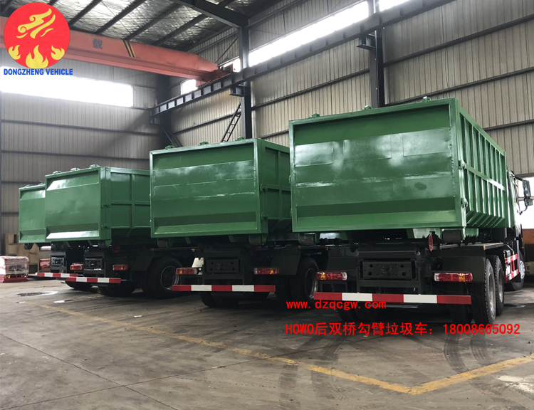 重汽豪沃后雙橋大型勾臂式垃圾車已下線,準(zhǔn)備發(fā)往港口。