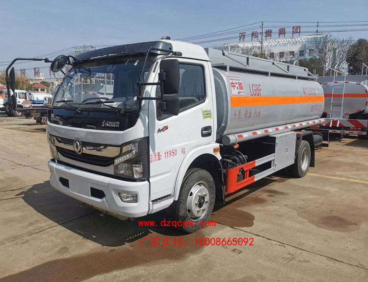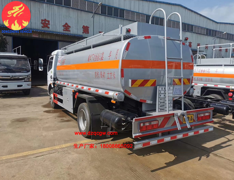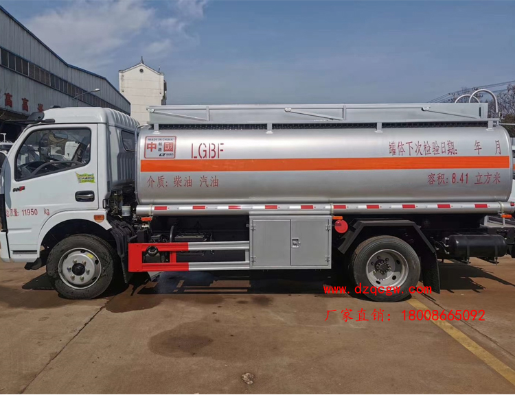 罐體容積10.3m3,罐體采用4.2mmQ235B鋼板制作,壹個鋁合金歐式罐口,專用油泵,可自吸自排,泵的出口在右邊,一個鋁合金海底閥(加裝聲光報警),正星大流量加油機(jī)及15米卷盤,加油機(jī)下掛至正駕一側(cè)。一套油氣回收裝置,一套防溢漏報警裝置,一個下裝口,一個靜電線盤,罐頂升降護(hù)欄。一個工具箱,一個防火帽,帶堵蓋,炮筒,配4KG滅火器。罐體先噴底漆再裝車,所有管道裝車時刷防銹漆,罐體金屬銀灰漆,貼反光線條及3號危險品標(biāo)。