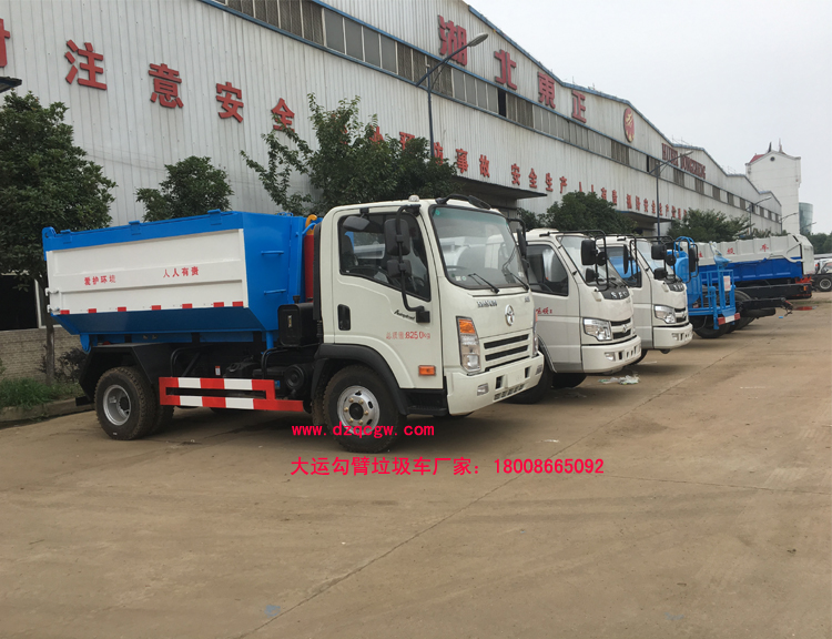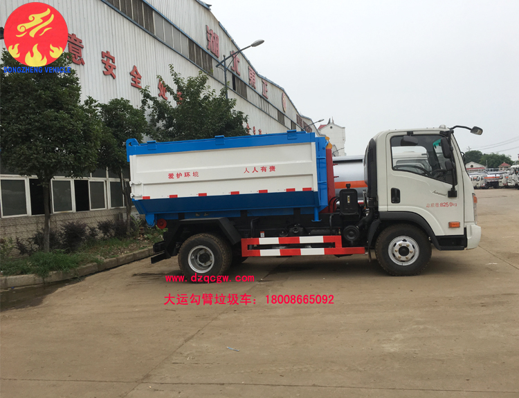 我公司關(guān)于大運勾臂車廂可卸式垃圾車有兩款公告,型號分別是SZD5082ZXXCG5型車廂可卸式垃圾車和SZD5042ZXXCG5型車廂可卸式垃圾車,一種為黃牌車廂可卸垃圾車,一種為藍(lán)牌車廂可卸垃圾車。藍(lán)牌大運車廂可卸式垃圾車軸距為3300mm,選用云內(nèi)115馬力或云內(nèi)130馬力發(fā)動機,鋼絲胎,5檔箱,ABS。黃牌大運車廂可卸式垃圾車軸距為3550mm,選用云內(nèi)170馬力國五發(fā)動機,鋼絲胎,小8檔箱,帶ABS。