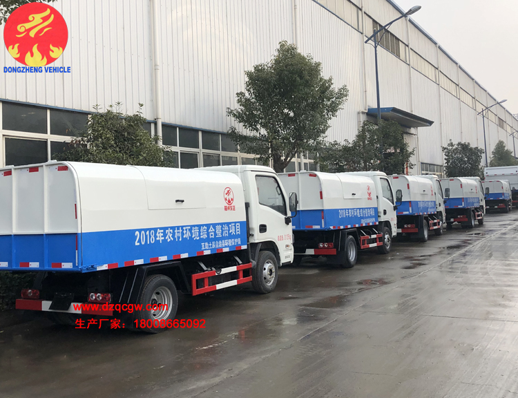此批自卸式垃圾車采用躍進小卡國五單橋底盤,2650mm軸距,柳州五菱87馬力汽油發(fā)動機。箱體采用邊3底4,雙頂,箱體側(cè)門可打開,后卸。上藍牌,適合農(nóng)村、街道、小區(qū)垃圾收集與轉(zhuǎn)運。